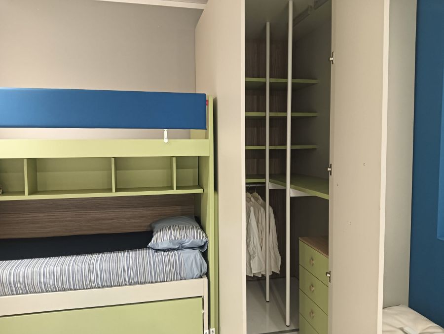 Il letto a castello scorrevole, con un terzo letto a scomparsa, offre una versatilità unica, permettendo di ottimizzare lo spazio senza rinunciare al comfort. La struttura è realizzata in nobilitato, garantendo resistenza e durata nel tempo.
