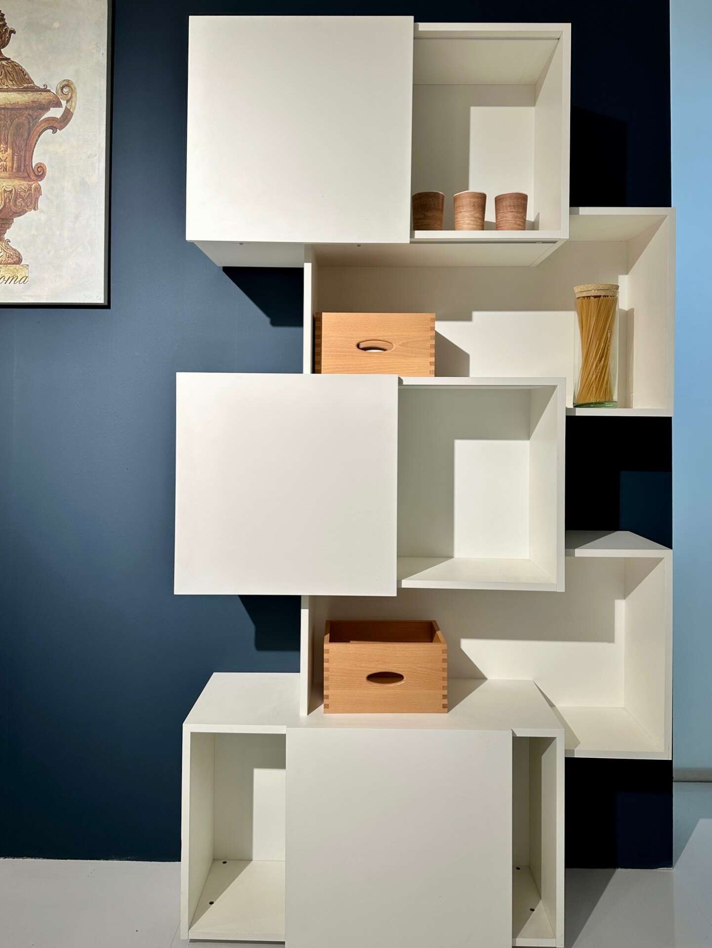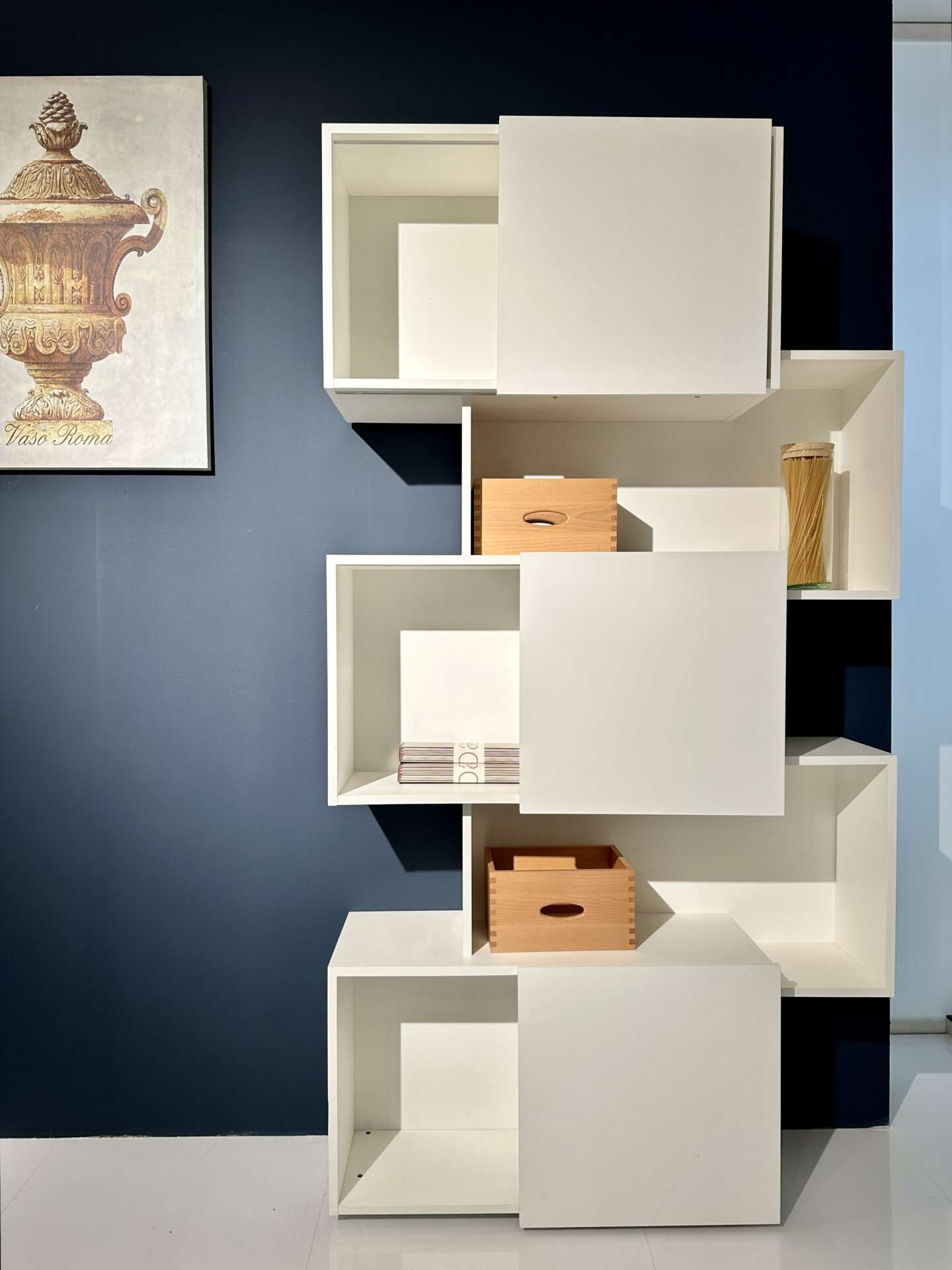 Libreria contenitore con struttura MDF goffrato fine bianco, ante scorrevoli in MDF goffrato fine bianco.