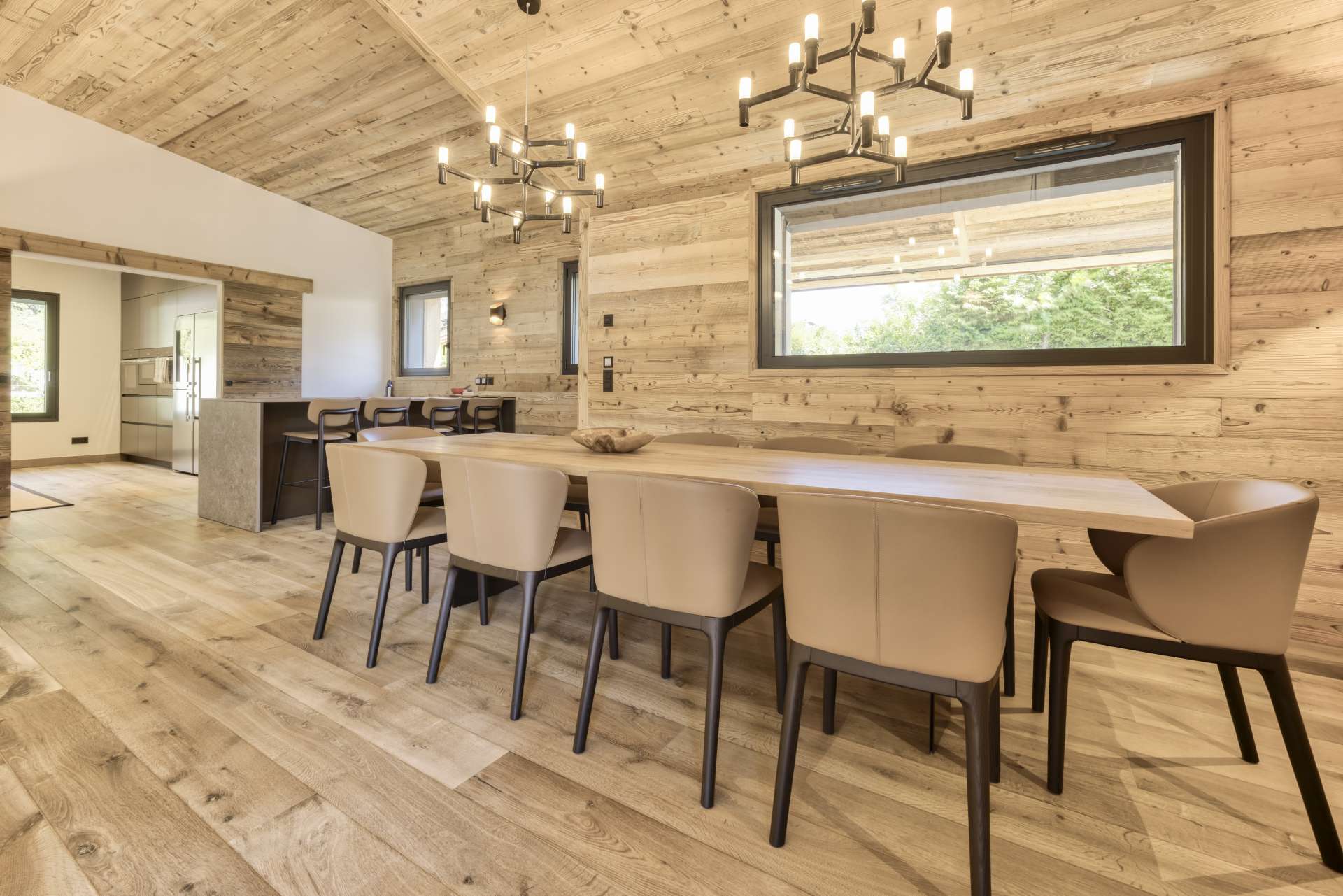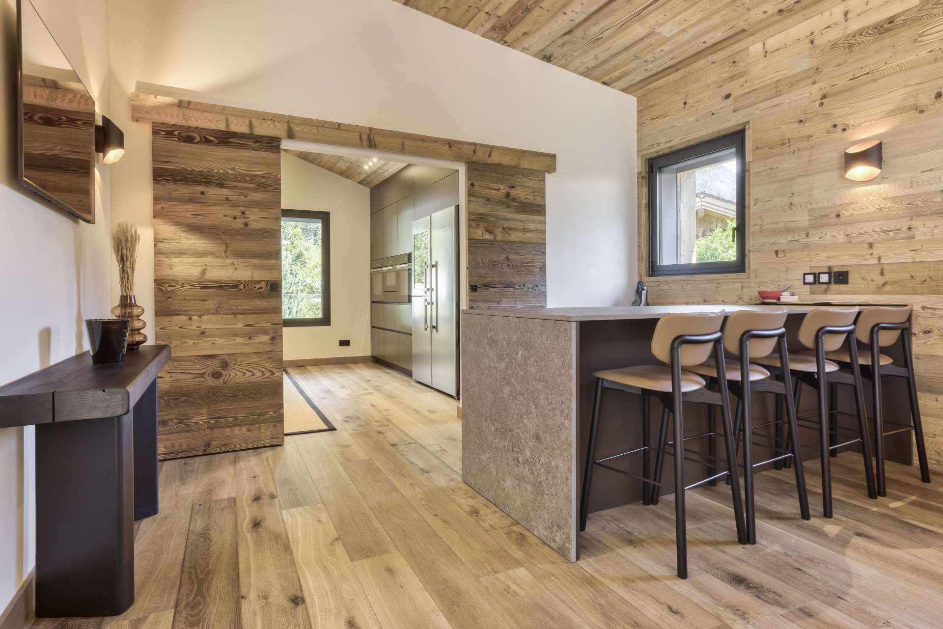 Gli ambienti si distinguono per un dialogo continuo tra materia, luce e proporzioni. Il legno naturale è il filo conduttore: presente nei soffitti, nei pavimenti, nelle boiserie e negli arredi su misura, crea una sensazione immediata di calore, accoglienza ed equilibrio. Le venature restano visibili, autentiche, e danno profondità agli spazi senza appesantirli.