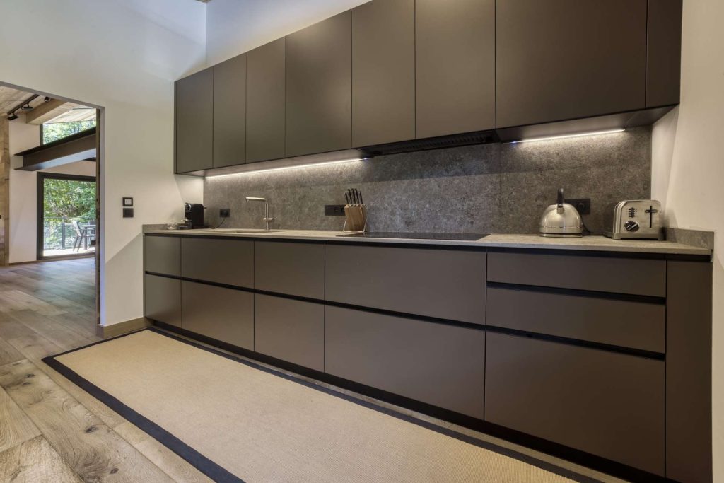 La cucina è essenziale e raffinata: volumi pieni, superfici opache, linee pulite. I toni scuri dei mobili dialogano con il piano e lo schienale in pietra, creando un contrasto elegante che valorizza la matericità senza perdere sobrietà. Tutto è integrato, ordinato, funzionale.