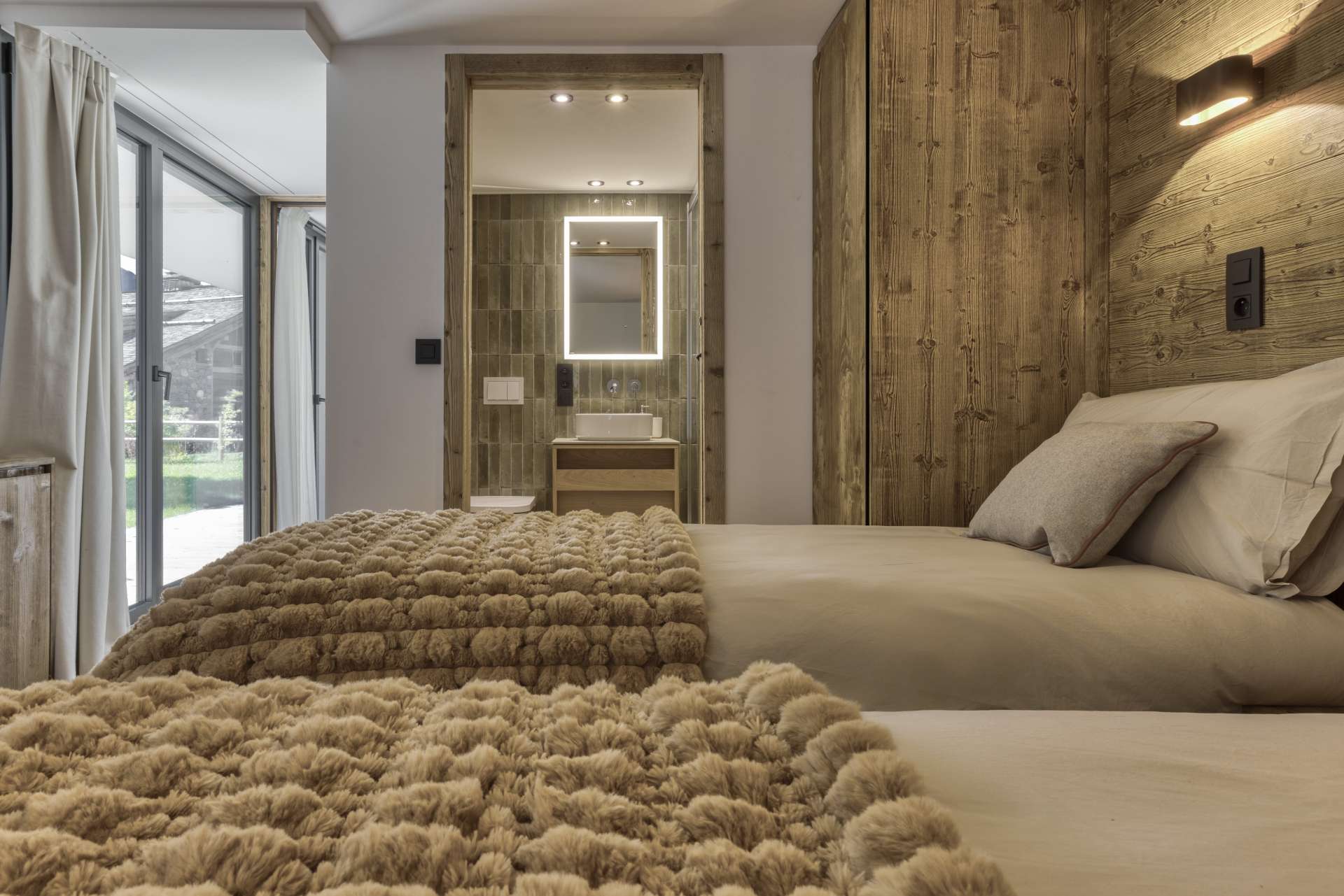 Le camere seguono la stessa filosofia: materiali naturali, palette neutre, arredi essenziali. Il legno avvolge lo spazio, mentre i tessili aggiungono comfort e intimità.